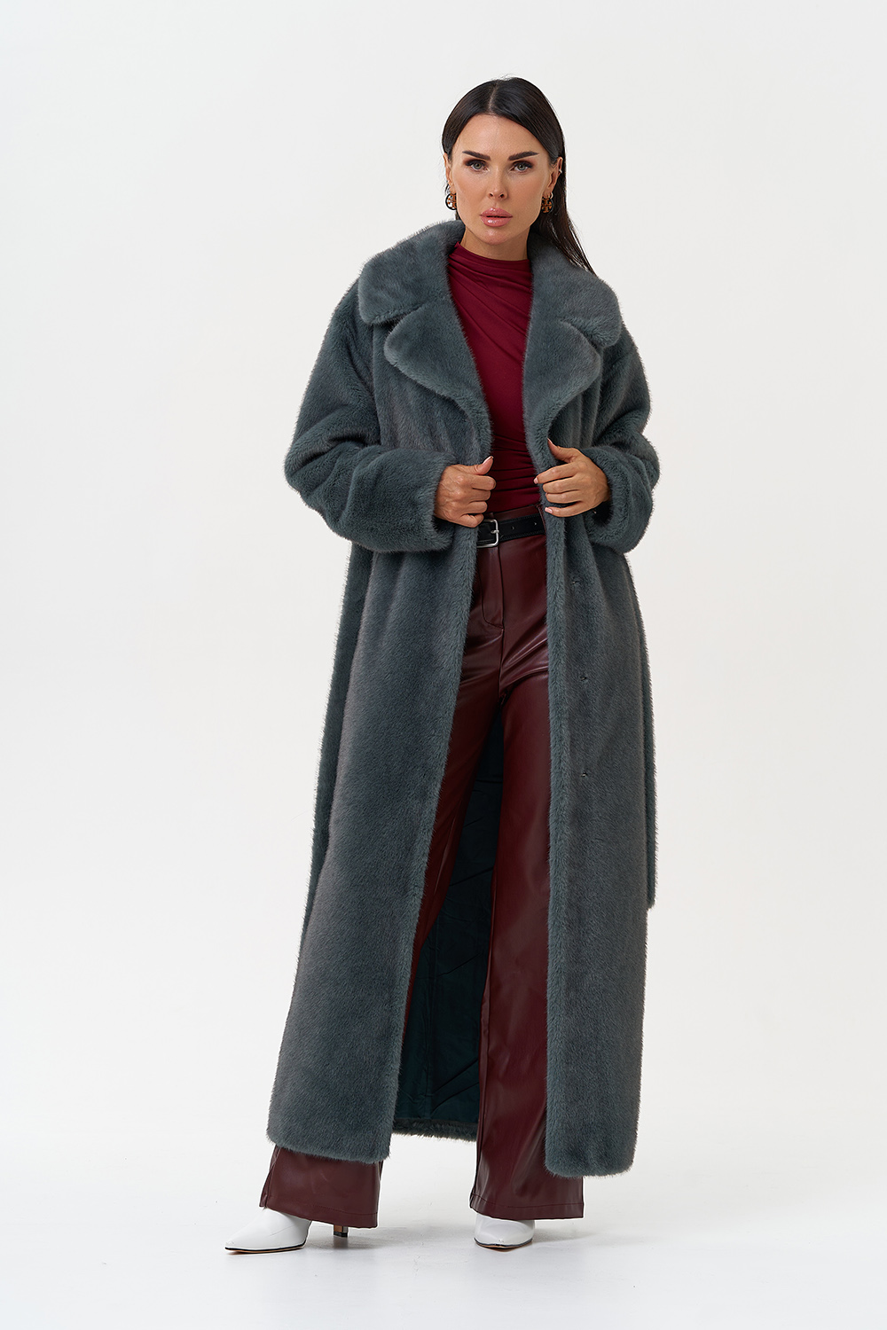 Фасон - прямой Длина изделия - 130 см Цвет - зеленый (ментол) Материал - экомех Состав полотна - полиэстер 100% Подкладка - полиэстер 100% Вид застежки -крючки, пояс Вид ворота - английский воротник Фасон рукава - втачной, длинный |