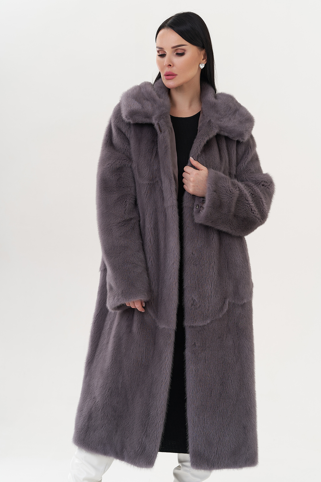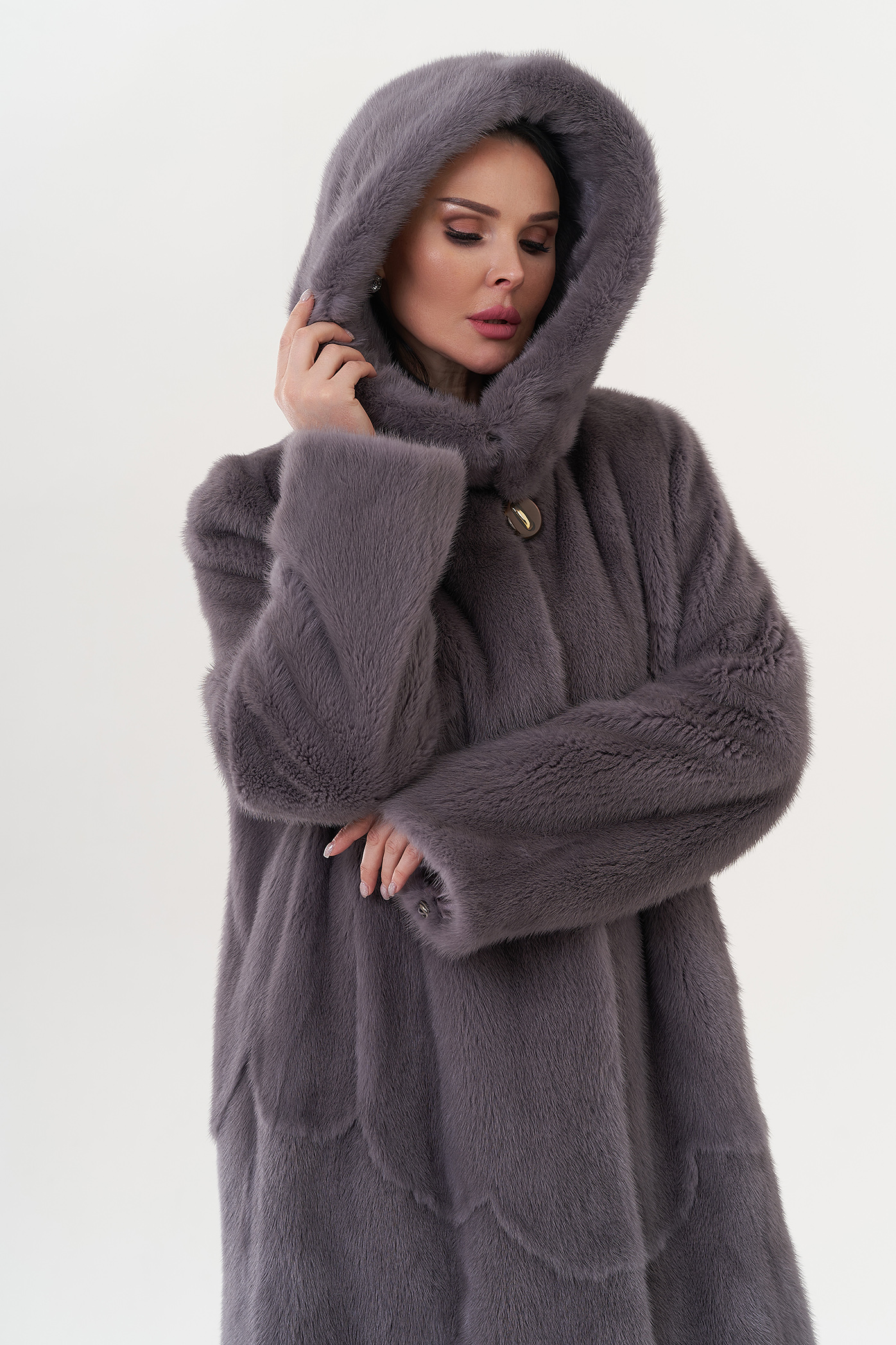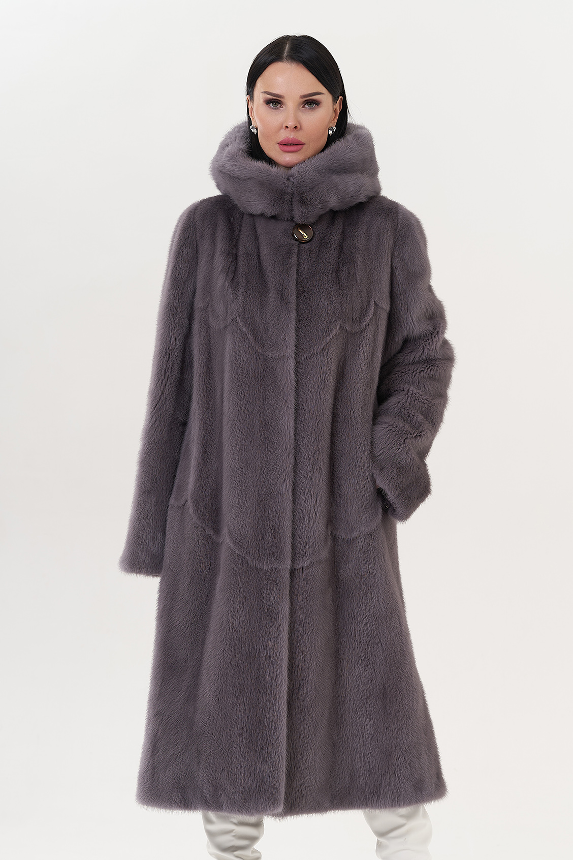 Норковая шуба с капюшоном в фиолетовом цвете.